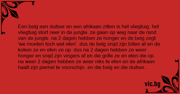 Een belg een duitser en een afrikaan zitten in het vliegtuig. het vliegtuig stort neer in de jungle. ze gaan op weg naar de rand van de jungle. na 2 dagen hebben ze honger en de belg zegt: