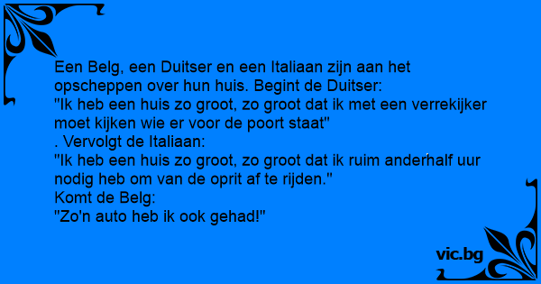 Een Belg, een Duitser en een Italiaan zijn aan het opscheppen over hun huis. Begint de Duitser: