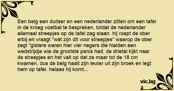 Een belg een duitser en een nederlander zitten om een tafel in de kroeg voetbal te bespreken, totdat de nederlander allemaal streepjes op de tafel zag staan. hij roept de ober erbij en vraagt "wat zijn dit voor streepjes" waarop de ober zegt "gistere waren hier vier negers die hielden een wedstrijdje wie de grootste реnis had. de drietal kijkt naar de streepjes en het valt op dat ze maar tot de 18 cm kwamen, dus de belg haalt zijn leuter uit zijn broek en legt hem op tafel. helaas hij komt niet verder dan de 14 cm, dan komt de duitser en ook hij legt zijn leuter op de tafel, hij haalt het net niet.