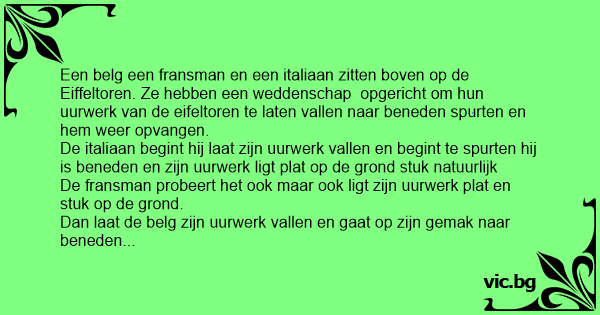 Een belg een fransman en een italiaan zitten boven op de Eiffeltoren. Ze hebben een weddenschap opgericht om hun uurwerk van de eifeltoren te laten vallen naar beneden spurten en hem weer opvangen. De italiaan begint hij laat zijn uurwerk vallen en begint te spurten hij is beneden en zijn uurwerk ligt plat op de grond stuk natuurlijk De fransman probeert het ook maar ook ligt zijn uurwerk plat en stuk op de grond. Dan laat de belg zijn uurwerk vallen en gaat op zijn gemak naar beneden gaat een koffie drinken en komt op de plaats waar zijn uurwerk gaat vallen en hij vangt zijn uurwerk op. De stomverbaasde fransman en italiaan vragen aan de belg hое hij dat deed Waarop de belg antwoordt: ik heb mijn uurwerk twee uur achter gezet.