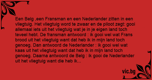 Een Belg ,een Fransman en een Nederlander zitten in een vliegtuig. Het vliegtuig word te zwaar en de piloot zegt: gooi allemaal iets uit het vliegtuig wat je in je eigen land toch teveel hebt. De fransman antwoord : ik gooi wel wat Frans brood uit het vliegtuig want dat heb ik in mijn land toch genoeg. Dan antwoord de Nederlander : ik gooi wel wat kaas uit het vliegtuig want dat heb ik in mijn land toch genoeg. Daarna antwoord de Belg : ik gooi de Nederlander uit het vliegtuig want die heb ik in mijn land toch genoeg..