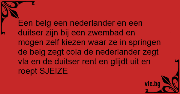 Een belg een nederlander en een duitser zijn bij een zwembad en mogen zelf kiezen waar ze in springen de belg zegt cola de nederlander zegt vla en de duitser rent en glijdt uit en roept SJEIZE