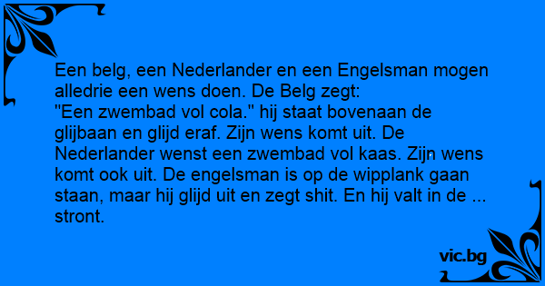 "Een zwembad vol cola." hij staat bovenaan de glijbaan en glijd eraf. Zijn wens komt uit. De Nederlander wenst een zwembad vol kaas. Zijn wens komt ook uit. De engelsman is op de wipplank gaan staan, maar hij glijd uit en zegt shiт. En hij valt in de ... sтrоnт.