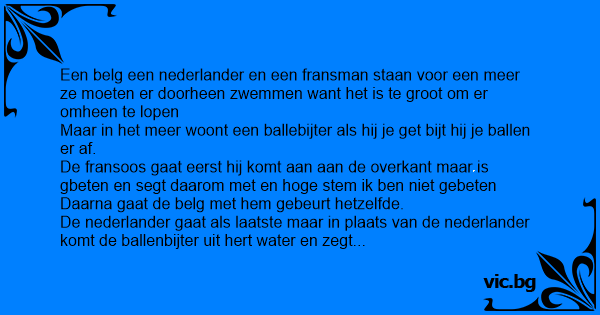 Een belg een nederlander en een fransman staan voor een meer ze moeten er doorheen zwemmen want het is te groot om er omheen te lopen