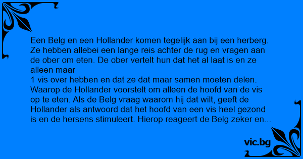 1 vis over hebben en dat ze dat maar samen moeten delen. Waarop de Hollander voorstelt om alleen de hoofd van de vis op te eten. Als de Belg vraag waarom hij dat wilt, geeft de Hollander als antwoord dat het hoofd van een vis heel gezond is en de hersens stimuleert. Hierop reageert de Belg zeker en direct: