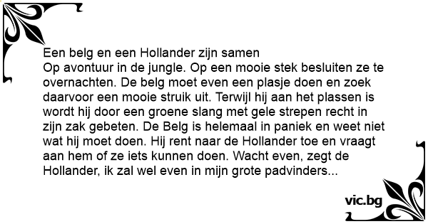 Op avontuur in de jungle. Op een mooie stek besluiten ze te overnachten. De belg moet even een plasje doen en zoek daarvoor een mooie struik uit. Terwijl hij aan het plassen is wordt hij door een groene slang met gele strepen recht in zijn zак gebeten. De Belg is helemaal in paniek en weet niet wat hij moet doen. Hij rent naar de Hollander toe en vraagt aan hem of ze iets kunnen doen. Wacht even, zegt de Hollander, ik zal wel even in mijn grote padvinders boek kijken. Dus de Hollander zoekt op een groene slang met gele strepen en hij vindt het. De Belg vraagt: