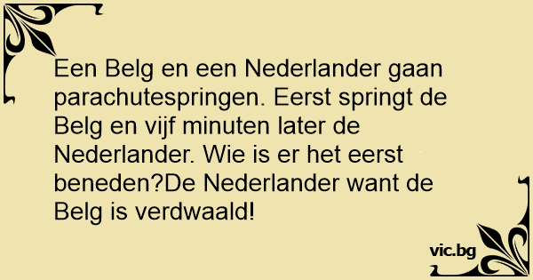 Een Belg en een Nederlander gaan parachutespringen. Eerst springt de Belg en vijf minuten later de Nederlander. Wie is er het eerst beneden?De Nederlander want de Belg is verdwaald!
