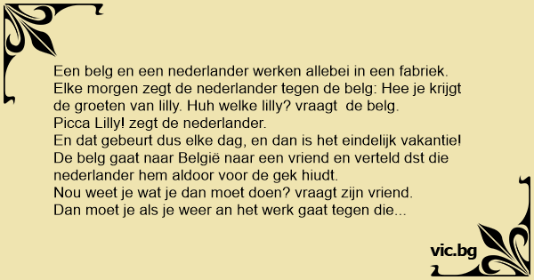 Elke morgen zegt de nederlander tegen de belg: Hee je krijgt de groeten van lilly. Huh welke lilly? vraagt de belg.