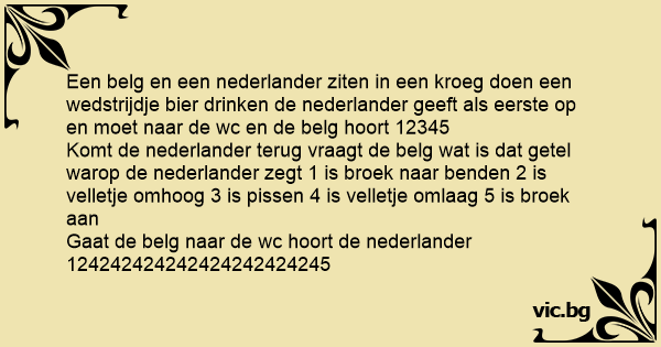 Een belg en een nederlander ziten in een kroeg doen een wedstrijdje bier drinken de nederlander geeft als eerste op en moet naar de wc en de belg hoort 12345