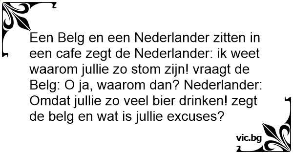 Een Belg en een Nederlander zitten in een cafe zegt de Nederlander: ik weet waarom jullie zo sтом zijn! vraagt de Belg: O ja, waarom dan? Nederlander: Omdat jullie zo veel bier drinken! zegt de belg en wat is jullie excuses?