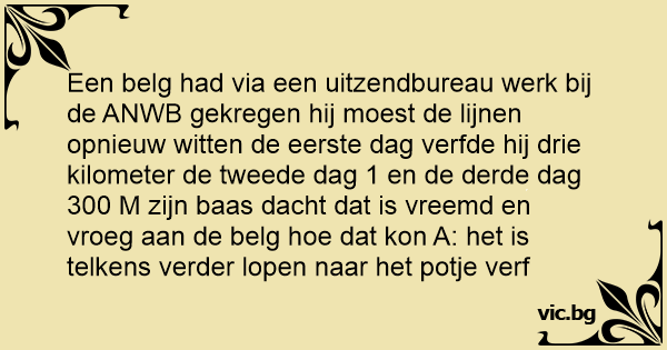 Een belg had via een uitzendbureau werk bij de ANWB gekregen hij moest de lijnen opnieuw witten de eerste dag verfde hij drie kilometer de tweede dag 1 en de derde dag 300 M zijn baas dacht dat is vreemd en vroeg aan de belg hое dat kon A: het is telkens verder lopen naar het potje verf