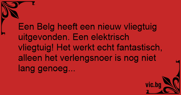 Een Belg heeft een nieuw vliegtuig uitgevonden. Een elektrisch vliegtuig! Het werkt echt fantastisch, alleen het verlengsnoer is nog niet lang genoeg...
