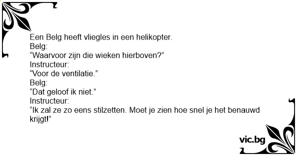 Teje och Harald åker helikopter. Terje säger: - Vad är det som snurrar ovanför oss? - Jag tror att det är luftkonditioneringen, för när den stannade blev piloten helt svettig.