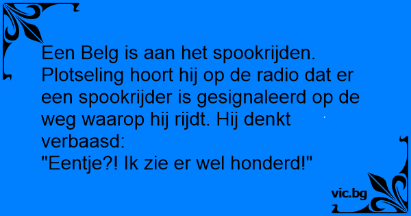 Een Belg is aan het spookrijden. Plotseling hoort hij op de radio dat er een spookrijder is gesignaleerd op de weg waarop hij rijdt. Hij denkt verbaasd: