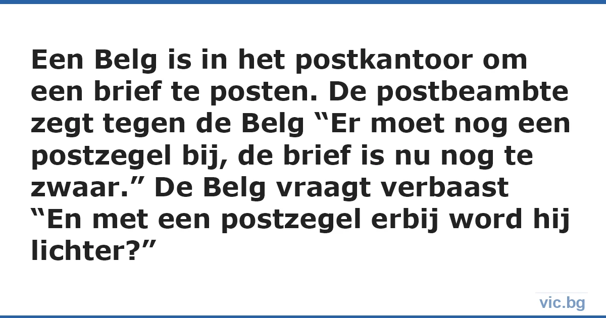 Een Belg is in het postkantoor om een brief te posten. De postbeambte zegt tegen de Belg “Er moet nog een postzegel bij, de brief is nu nog te zwaar.” De Belg vraagt verbaast