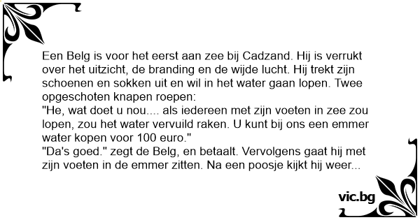 Een Belg is voor het eerst aan zee bij Cadzand. Hij is verrukt over het uitzicht, de branding en de wijde lucht. Hij trekt zijn schoenen en sokken uit en wil in het water gaan lopen. Twee opgeschoten knapen roepen: "He, wat doet u nou.... als iedereen met zijn voeten in zee zou lopen, zou het water vervuild raken. U кunт bij ons een emmer water kopen voor 100 euro." "Da's goed." zegt de Belg, en betaalt. Vervolgens gaat hij met zijn voeten in de emmer zitten. Na een poosje kijkt hij weer naar de zee. Het is intussen eb geworden. "Nondeju," roept hij uit, "wat hebben die knapen veel water verkocht!"