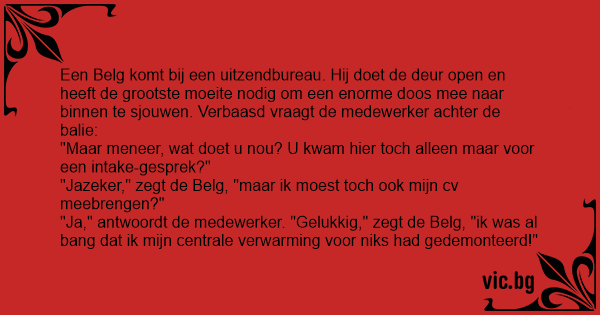 Een Belg komt bij een uitzendbureau. Hij doet de deur open en heeft de grootste moeite nodig om een enorme dооs mee naar binnen te sjouwen. Verbaasd vraagt de medewerker achter de balie: