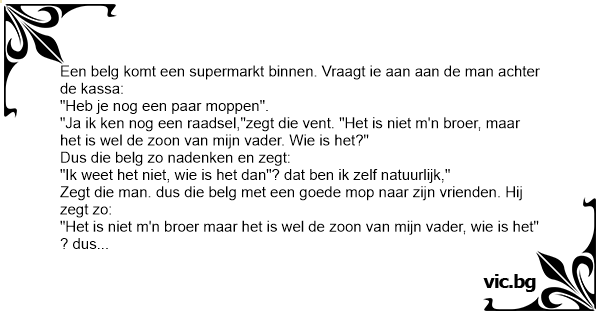 "Ja ik ken nog een raadsel,"zegt die vent. "Het is niet m'n broer, maar het is wel de zoon van mijn vader. Wie is het?"