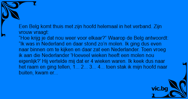 Een Belg komt thuis met zijn hoofd helemaal in het verband. Zijn vrouw vraagt: