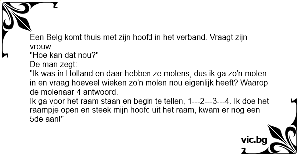 Een Belg komt thuis met zijn hoofd in het verband. Vraagt zijn vrouw: