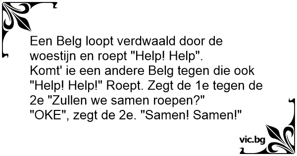 Komt' ie een andere Belg tegen die ook "Help! Help!" Roept. Zegt de 1e tegen de 2e "Zullen we samen roepen?"
