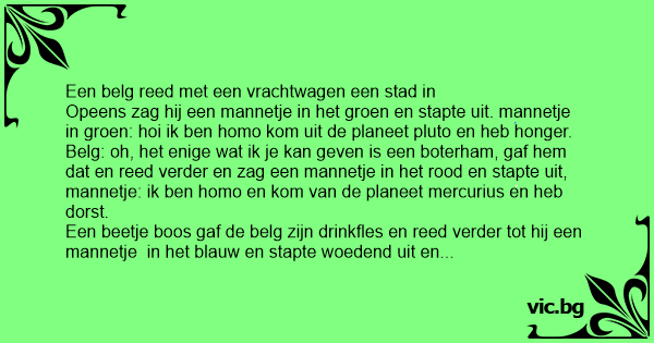 Belg: oh, het enige wat ik je kan geven is een boterham, gaf hem dat en reed verder en zag een mannetje in het rood en stapte uit, mannetje: ik ben hомо en kom van de planeet mercurius en heb dorst.