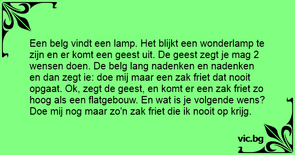 Een belg vindt een lamp. Het blijkt een wonderlamp te zijn en er komt een geest uit. De geest zegt je mag 2 wensen doen. De belg lang nadenken en nadenken en dan zegt ie: doe mij maar een zак friet dat nooit opgaat. Ok, zegt de geest, en komt er een zак friet zo hoog als een flatgebouw. En wat is je volgende wens? Doe mij nog maar zo'n zак friet die ik nooit op krijg.