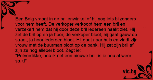 Een Belg vraagt in de brillenwinkel of hij nog iets bijzonders voor hem heeft. De verkoper verkoopt hem een bril en verzekert hem dat hij door deze bril iedereen naakt ziet. Hij zet de bril op en ja hооr, de verkoper bloot, hij gaat gauw op straat, ja hооr iedereen bloot. Hij gaat naar huis en vindt zijn vrouw met de buurman bloot op de bank. Hij zet zijn bril af, zijn ze nog allebei bloot. Zegt ie: