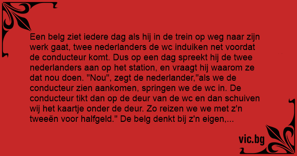 Een belg ziet iedere dag als hij in de trein op weg naar zijn werk gaat, twee nederlanders de wc induiken net voordat de conducteur komt. Dus op een dag spreekt hij de twee nederlanders aan op het station, en vraagt hij waarom ze dat nou doen. "Nou", zegt de nederlander,"als we de conducteur zien aankomen, springen we de wc in. De conducteur tikt dan op de deur van de wc en dan schuiven wij het kaartje onder de deur. Zo reizen we we met z'n tweeën voor halfgeld." De belg denkt bij z'n eigen, dat is best goed idee van die nederlanders. Dus de volgende dag staat met een andere belg op het station en ziet hij de nederlander in z'n eentje staan en begint te lachen. De belg stapt in de trein, na tien minuten ziet hij in de verte de conducteur aankomen, dus hij waarschuwt de andere belg en ze springen de wc. Een tijdje later word er op de deur van de wc geklopt, de belg steekt z'n kaartje onder de deur door, roept de nederlander: