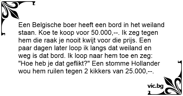 Een Belgische boer heeft een bord in het weiland staan. Koe te koop voor 50.000,--. Ik zeg tegen hem die raak je nooit kwijt voor die prijs. Een paar dagen later loop ik langs dat weiland en weg is dat bord. Ik loop naar hem toe en zeg: