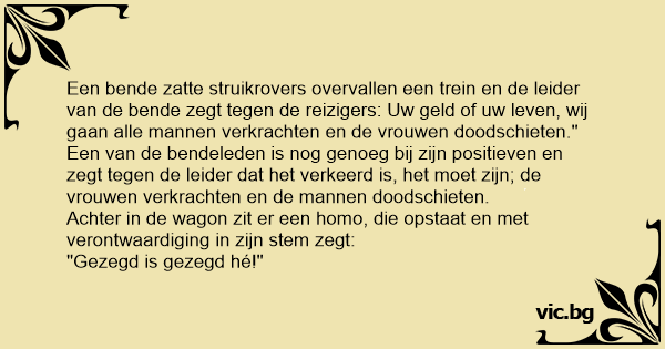Een bende zatte struikrovers overvallen een trein en de leider van de bende zegt tegen de reizigers: Uw geld of uw leven, wij gaan alle mannen verkrachten en de vrouwen doodschieten."