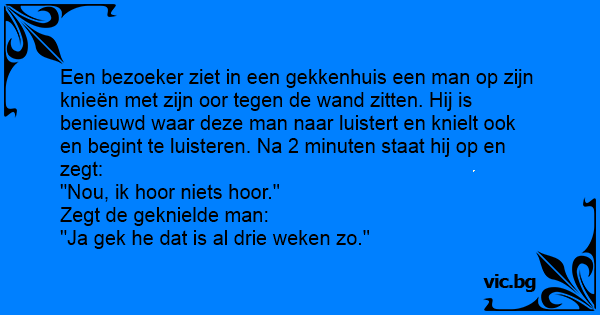 Een bezoeker ziet in een gekkenhuis een man op zijn knieën met zijn oor tegen de wand zitten. Hij is benieuwd waar deze man naar luistert en knielt ook en begint te luisteren. Na 2 minuten staat hij op en zegt: