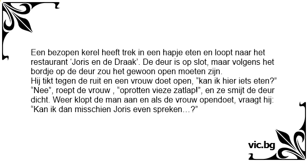 Een bezopen kerel heeft trek in een hapje eten en loopt naar het restaurant ‘Joris en de Draak’. De deur is op slot, maar volgens het bordje op de deur zou het gewoon open moeten zijn.