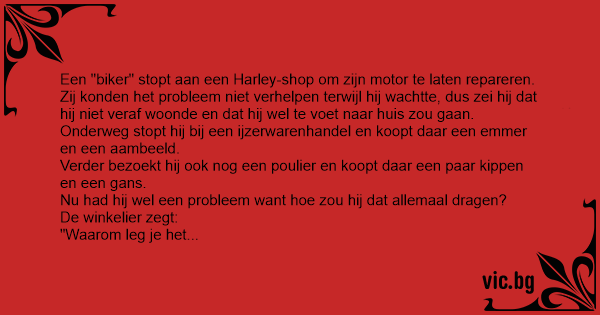 "Verdekke madammeke", zegt den biker "zie mij hier staan met mijnen emmer, aambeeld, 2 kiekens en een gans in mijn handen; hое in hemelsnaam kan ik je nu tegen de muur aandrukken en al hetgene doen wat je hier zegt?"