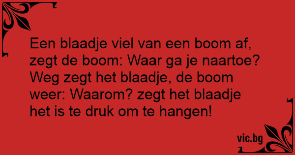 Een blaadje viel van een boom af, zegt de boom: Waar ga je naartoe? Weg zegt het blaadje, de boom weer: Waarom? zegt het blaadje het is te druk om te hangen!