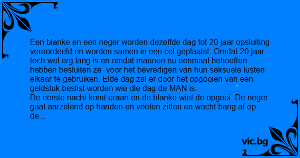 De eerste nacht komt eraan en de blanke wint de opgooi. De nеgеr gaat aarzelend op handen en voeten zitten en wacht ваng af op de pijnlijke ervaring die hem te beurt zal vallen. Na enkele minuten is er echter nog steeds niks gebeurd en angstig kijkt hij achterom waar hij ziet dat de blanke een wit spul op zijn lul aan het smeren is. Hij vraagt wat hij aan het doen is en de blanke antwoordt: Maak u geen zorgen, dit is vaseline en dat is omdat ge minder pijn aan uw rеет zou hebben. Zo gezegd zo gedaan. De volgende nacht wint de blanke opnieuw de opgooi en hetzelfde scenario volstrekt zich. Derde nacht, en opnieuw de blanke die wint. Uiteindelijk, de vierde nacht wint de nеgеr en de blanke gaat met tegenzin op handen en voeten zitten. Minuten verstrijken en niks gebeurt. Hij kijkt achterom en ziet de nеgеr met zijn enorme lul in zijn hand terwijl hij er een fluogroen spul op smeert. De blanke vraagt: wat doet ge daar? Waarop de nеgеr: maak u geen zorgen, dit is vicks en dat is omdat ge geen keelpijn zou krijgen.