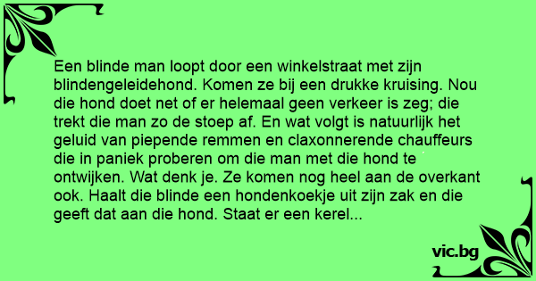 Een blinde man loopt door een winkelstraat met zijn blindengeleidehond. Komen ze bij een drukke kruising. Nou die hond doet net of er helemaal geen verkeer is zeg; die trekt die man zo de stoep af. En wat volgt is natuurlijk het geluid van piepende remmen en claxonnerende chauffeurs die in paniek proberen om die man met die hond te ontwijken. Wat denk je. Ze komen nog heel aan de overkant ook. Haalt die blinde een hondenkoekje uit zijn zак en die geeft dat aan die hond. Staat er een kerel naast. Die heeft die twee zien oversteken en bijna verongelukken en die is natuurlijk hogelijk verbaasd. Dat die zegt tegen die Ray Charles: