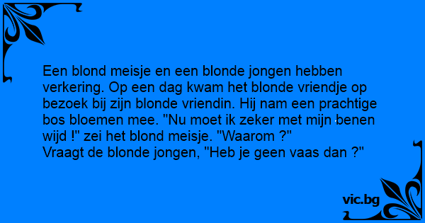 Een blond meisje en een blonde jongen hebben verkering. Op een dag kwam het blonde vriendje op bezoek bij zijn blonde vriendin. Hij nam een prachtige bos bloemen mee. "Nu moet ik zeker met mijn benen wijd !" zei het blond meisje. "Waarom ?"