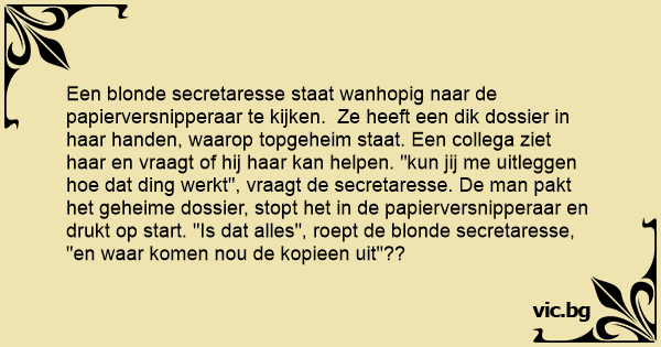 Een blonde secretaresse staat wanhopig naar de papierversnipperaar te kijken. Ze heeft een dik dossier in haar handen, waarop topgeheim staat. Een collega ziet haar en vraagt of hij haar kan helpen. "kun jij me uitleggen hое dat ding werkt", vraagt de secretaresse. De man pakt het geheime dossier, stopt het in de papierversnipperaar en drukt op start. "Is dat alles", roept de blonde secretaresse, "en waar komen nou de kopieen uit"??