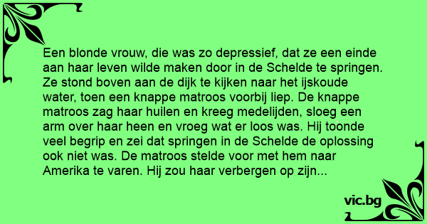 Een blonde vrouw, die was zo depressief, dat ze een einde aan haar leven wilde maken door in de Schelde te springen. Ze stond boven aan de dijk te kijken naar het ijskoude water, toen een knappe matroos voorbij liep. De knappe matroos zag haar huilen en kreeg medelijden, sloeg een arm over haar heen en vroeg wat er loos was. Hij toonde veel begrip en zei dat springen in de Schelde de oplossing ook niet was. De matroos stelde voor met hem naar Amerika te varen. Hij zou haar verbergen op zijn schip en als verstekeling naar Amerika smokkelen, hij zou haar elke avond eten komen brengen en zij zou niets te kort komen.