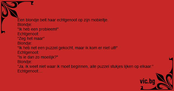 Een dom blondje belt haar man op. Blondje: “Schat, ik heb een probleem!” Man: “Vertel...” Blondje: “Ik ben vanmiddag aan een puzzel begonnen maar ik kom er niet uit!” Man: “Zo moeilijk zou het...