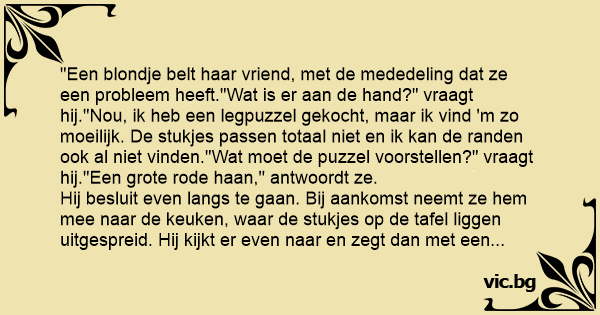 Een dom blondje belt haar man op. Blondje: “Schat, ik heb een probleem!” Man: “Vertel...” Blondje: “Ik ben vanmiddag aan een puzzel begonnen maar ik kom er niet uit!” Man: “Zo moeilijk zou het...