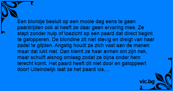 Een blondje besluit op een mooie dag eens te gaan paardrijden ook al heeft ze daar geen ervaring mee. Ze stapt zonder hulp of toezicht op een paard dat direct begint te galopperen. De blondine zit niet stevig en dreigt van haar zadel te glijden. Angstig houdt ze zich vast aan de manen maar dat lukt niet. Dan klemt ze haar armen om zijn nek, maar schuift alsnog omlaag zodat ze bijna onder hem terecht komt. Het paard heeft dit niet door en galoppeert door! Uiteindelijk laat ze het paard los, hopend op de grond te vallen. Haar hoofd botst enkele keren op de grond en ze valt bijna flauw, totdat...... De manager van de winkel haar ziet en de stekker uit het stopcontacht trekt