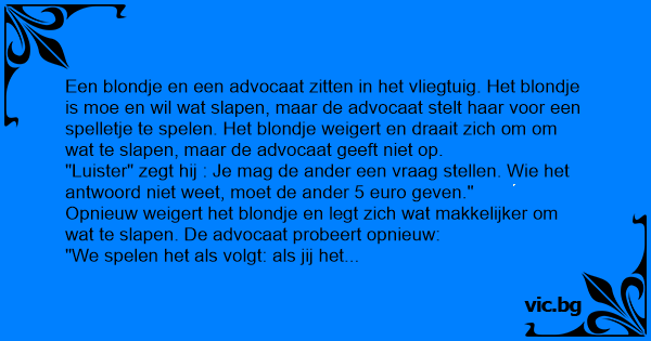 Het blondje neemt spontaan haar portemonnee en geeft 5 euro aan de advocaat. Die glundert en zegt : Nu is het uw beurt om mij iets te vragen. Het blondje denkt even na en vraagt dan: