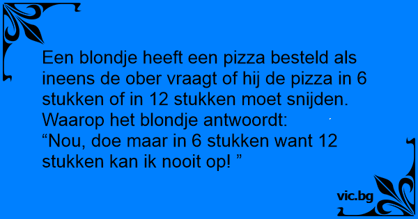 Een dom blondje gaat naar de pizzeria en bestelt een pizza Margerita Zegt de pizzaman na een tijdje wil je de pizza in 6 of in 10 stukken gesneden?? Zegt het domme blondje; in 6 stukken, want 10...