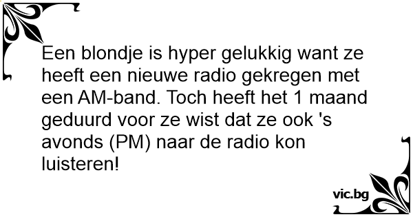 Een blondje is hyper gelukkig want ze heeft een nieuwe radio gekregen met een AM-band. Toch heeft het 1 maand geduurd voor ze wist dat ze ook 's avonds (PM) naar de radio kon luisteren!