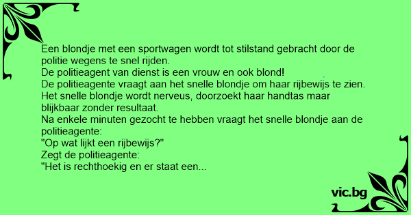 Blondinen kjørte for fort og ble stoppet av politiet. Det viste seg at det var ei blond politidame som stoppet henne. - Du kjørte for fort, vis meg førerkortet ditt sa den blonde politidamen. -...