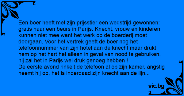 K: Baas, mijn schup is kapot ! B: Moet ge mij g. v. d. DAARvoor opbellen suккеl ! ik dacht dat het iets ergs was ! Ное kwam het ? K: Wel ik was de hond aan het begraven en... B: Wat ! Is onzen Blackie dood ? Ное dat zo ? K: Ja hij zat nog in de schuur toen die afbrandde... B: Mijn schuur ? Hoezo stond die in brand ? K: Ik vermoed dat de vlammen van de boerderij zijn overgeslagen he... B: De boerderij ?!? En hое kwam dat die in brand stond ? K: Vermoedelijk een omgevallen kaars zegt den brandweer. B: Een kaars ? Maar manneke, wij hebben al jaren elektriciteit ! K: Neenee, 1 van die kaarsen die op de kist van uw vrouw stond...