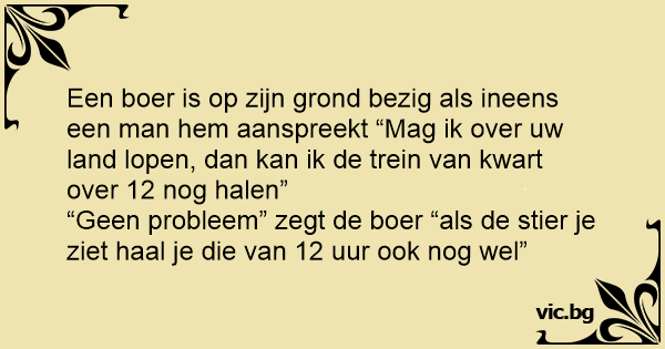 “Geen probleem” zegt de boer “als de stier je ziet haal je die van 12 uur ook nog wel”