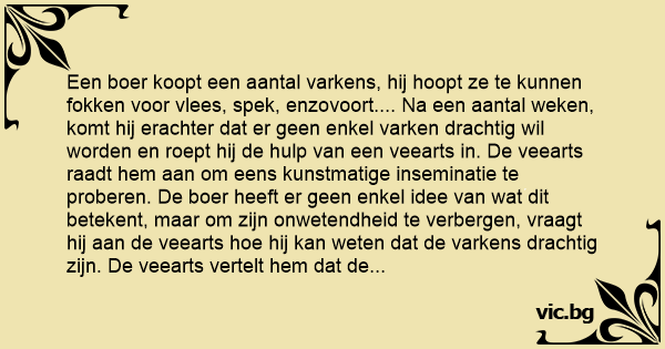 Een boer koopt een aantal varkens, hij hoopt ze te kunnen fokken voor vlees, spek, enzovoort.... Na een aantal weken, komt hij erachter dat er geen enkel varken drachtig wil worden en roept hij de hulp van een veearts in. De veearts raadt hem aan om eens kunstmatige inseminatie te proberen. De boer heeft er geen enkel idee van wat dit betekent, maar om zijn onwetendheid te verbergen, vraagt hij aan de veearts hое hij kan weten dat de varkens drachtig zijn. De veearts vertelt hem dat de varkens minder zullen staan en in plaats daarvan veel zullen liggen en in de modder zullen liggen rollen wanneer ze drachtig zijn.